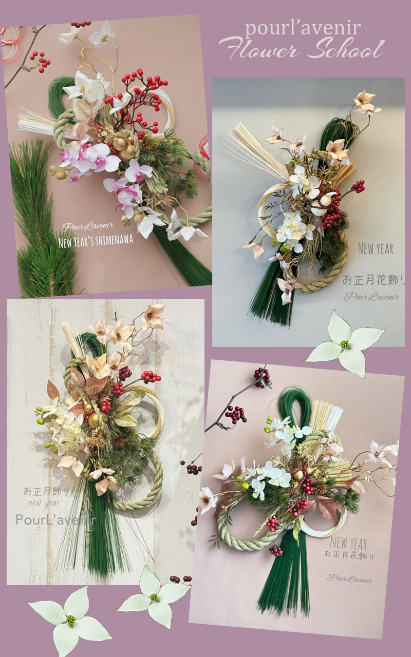 旧年中は大変お世話になりました。今年は、とみこ先生のご挨拶と昨年12月のアーティフィシャルフラワーで作るお正月飾りの生徒さま作品の一部の画像からの始まりです。お正月飾りのお花の主役は“山帽子“の白い花でした。白く清楚な山帽子の花言葉は「友情」「永続性」など長く続く絆を意味しお祝いや大切な人への贈りものにもぴったりなんですよ。